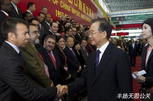 10月14日,第110届中国进出口商品交易会(广交会)开幕式暨中国加入世界贸易组织十周年论坛在广州隆重举行。中共中央政治局常委、国务院总理温家宝出席开幕式并发表讲话。这是温家宝同出席开幕式的澳门特区行政长官崔世安亲切见面。广交会副主任兼秘书长王志平、广交会副主任文仲亮、广交会副秘书长刘建军、大会政工办主任燕毅、大会政工办常务副主任任志坚以及轻工商会和食土商会的负责人等陪同视察。